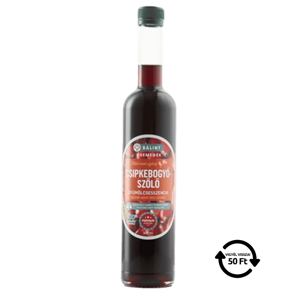A Csipkebogyó–szőlő Bálint szörp egy harmonikus, gyümölcsös-fűszeres ízvilágú különlegesség, amely a szőlőlé természetes édességét ötvözi a csipkebogyó és feketeberkenye karakteres aromáival. Frissítő italokhoz, desszertekhez és sültekhez egyaránt ajánlott.